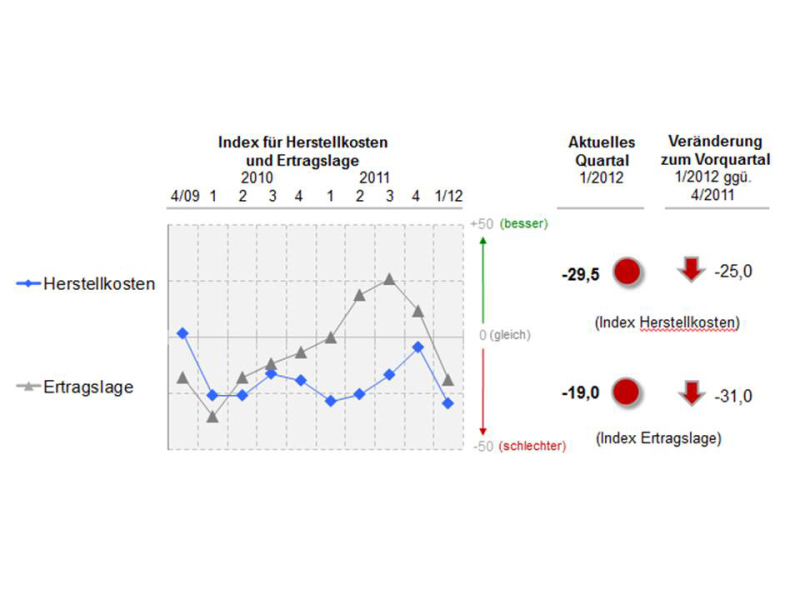 Die exorbitant gestiegenen Rohstoffpreiserhöhungen seit Jahresbeginn bis April sind trotz positiver Absatzentwicklung aber mehr als nur ein „Wehrmutstropfen“. Angesichts ihrer Entwicklung  fällt der Index für die Herstellungskosten in Q.I. deutlich in den negativen Bereich. Mit einem Wert von –29,5 erreicht der Index seinen tiefsten Wert seit Erhebungsbeginn.