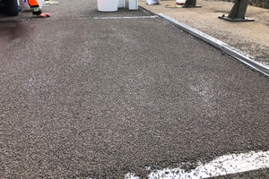 Nachdem die Grundierung grifftrocken war, konnte der gefräste Bereich im Anschluss mit Triflex Asphalt Repro 3K 1:3 thix auf Fahrbahnniveau reprofiliert werden und wurde unmittelbar danach mit Splitt (Hartkorn 1–3 mm) abgestreut. Der Verbrauch von Triflex Asphalt Repro 3K 1:3 thix belief sich auf ca. 20 kg pro 1 cm/m² Verbrauch, Hartkorn: ca. 5 kg/m².