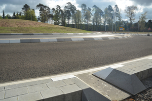 Andreas Herrmann erläutert die Vorteile: „Auf den gering porigen glatten Flächen hält die Verklebung besonders gut. Außerdem werden fertigungsbedingte Höhenschwankungen eliminiert und damit die Steine für die Verklebung kalibriert. Maßtoleranzen sind so nahezu ausgeschlossen. Ein weiterer Vorteil ist der trotz der vielen zu realisierenden Bypässe, Fahrbahnteiler und Fahrbahneinfassungen geringe Schneideaufwand. Er resultiert aus den zahlreichen Radien und Formsteinen, die das Sortiment aus dem Hause Meudt umfasst, ermöglicht ein sauberes Arbeiten und spart letztendlich beim Einbau viel Zeit“, erklärt Herrmann.