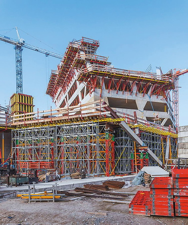 Auf Basis des Variokit Ingenieurbaukastens entwickelten Ingenieure von Peri eine Tragwerkskonstruktion, um die Lasten der auskragenden Gebäudesegmente sicher abzutragen. Projektspezifisch konzipierte Tragwerkseinheiten aus mietbaren Systembauteilen leiteten hierbei die hohen Lasten bis zum Erreichen der Eigentragfähigkeit in das Bauwerk und die bereits fertiggestellten Rohbaugeschosse ab. Eine Lastabtragung mittels Raumgerüst war aufgrund des geringen Abstands zum Nachbargebäude nicht möglich und hätte zudem einen größeren Aufwand bedeutet.