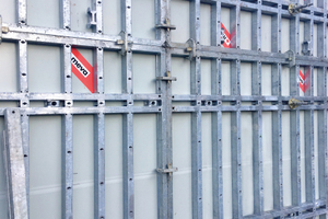 Abgestützt wurde die hohe Schalung in über 6 m Höhe mit der Dreigurtstütze Triplex. Zubehörteile wie Laufkonsolen, die selbstsichernden Ankerstabhalter sowie Schalschlösser bleiben beim Umsetzen an der Schalung. Das erleichtert die Logistik auf der Baustelle, indem die Teile nicht separat gelagert, transportiert oder gesucht werden müssen.