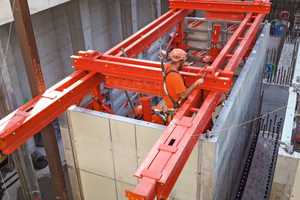 Zur Vorbereitung der Gebäudekerne wurde im dritten Untergeschoss zunächst eine Aufzugsunterfahrt in die 2,5 Meter starke Bodenplatte integriert. Durch die Integration der Schächte ist die Platte an dieser Stelle rund 4,25 Meter stark. Um Platz für die spätere Installation der Fahrstühle zu schaffen, musste die Geometrie der Kerne dabei genau berücksichtigt werden. Gleichzeitig begann bereits die Anlieferung der Stützböcke sowie der Wandschalung Mammut 350.