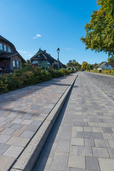 Während das Kopfsteinpflaster des im Dachprofil angelegten Mittelstreifens im so genannten Segmentbogenverband verarbeitet worden ist, erfolgte die Verlegung von Gehweg und Radfahrbahnen im regelmäßig, linearen Reihenverband. Hierzu bediente sich das ausführende Unternehmen SIWA Siemon & Wallis aus dem benachbarten Zingst jeweils drei verschiedener Steinformate mit den Längen 24,7 cm, 16,5 cm und 12,3 cm bei dem selben Breitenmaß von 16,5 cm. Sowohl das Citypflaster als auch die TerrIntak-Steine zeichnen sich durch ihre ebene Oberfläche, streng kubische Form und Mikrofase aus. Engfugig verlegt lassen sich hiermit geschlossene Flächenbeläge schaffen, die besonders lauf- und rollfreundlich sind. Ein weiteres Auswahlkriterium der Planer war der zweischichtige Aufbau der insgesamt acht cm starken Betonpflastersteine von Ehl mit Edelsplittvorsatz. Der sorgt für belastungsstarke und witterungsresistente Oberflächen auch beim Einsatz von Taumitteln.
