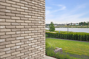 Da die Bauherren Wert auf eine Ziegelfassade legten, musste Engelshove als überzeugte „Zieglerin“ keine Überredungskunst für eine Hintermauer und Innenwände aus gebranntem Ton aufbringen. Ohnehin überzeugen auch die technischen Eigenschaften der zweischaligen Ziegelkonstruktion: Dank der zweischaligen Konstruktion mit dem unverfüllten Poroton-Planziegel-T16 in der Stärke 17,5 Zentimeter wird eine sehr gute Wärmedämmung erzielt. Dieser Wandaufbau zeichnet sich auch durch Nachhaltigkeit, Langlebigkeit sowie Wartungsarmut aus und hat positive Wirkung auf das Raumklima. Dazu tragen zusätzlich die Innenwände aus Poroton-Hochlochziegeln von Wienerberger bei. Sie wurden in den Stärken 17,5 und 11,5 Zentimeter errichtet. Das Ziegelmaterial nimmt Feuchte und Wärme auf, gibt sie zeitversetzt im Raum ab und sorgt so für behagliche Verhältnisse – zu jeder Jahreszeit: Angesichts der großzügigen Verglasung auf drei Etagen der Villa eine weitsichtige Empfehlung der Architektin.