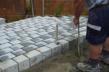 Bei den im Garten- und Landschaftsbau herzustellenden Flächen handelt es sich oft um Treppen, Podeste, Balkone und Terrassen, welche im Rahmen der gesamten Gestaltung von Außenanlagen mit auszuführen sind. Diese Flächen sind daher in der Regel der Bewitterung und Durchfeuchtung ausgesetzt. In diesem Zusammenhang ist darauf zu achten, dass alle Flächen mit entsprechendem Gefälle ausgeführt werden. Denn dort, wo notwendige Gefälle nicht berücksichtigt werden, führt dies oftmals zu dauerhaften Durchfeuchtungen des Natursteins. Die Gesamtkonstruktion ist zudem gegen eine Durchfeuchtung durch den Einsatz einer Verbundabdichtung zu schützen. In der Praxis bedeutet dies, dass die zunächst hergestellte Gefällespachtelung bzw. der Gefälleestrich mit einer zementären, flexiblen Dichtungsschlämme (Sopro Dichtschlämme Flex 1-K) in zwei Arbeitsgängen abzudichten ist. Nachdem dies geschehen ist, kann die oben beschriebene Verlegung der Platten im Dünn- bzw. Mittelbett erfolgen. Die angesprochenen Verlegemörtel sind auf die sogenannte Verbundabdichtung abgestimmt.