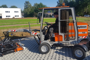 Die Optimas T22 ist dafür konzipiert, maschinelle Pflasterverlegung zu leisten. Sie ist aber nicht als ausschließliche Leistungsmaschine gedacht, sondern für gelegentliche oder kleinere Einsätze. Deshalb ist sie für jeden Baggerfahrer etc. einfach handhabbar. Das heißt, die Funktion Heben und Senken wird mit dem Joystick ausgeführt. Analog zum Bagger. Eine Umgewöhnung ist deshalb nicht notwendig. Damit sie überall guten Zugang hat, wurden die Außenmaße klein gehalten. Nur 2.000 mm Höhe und 1.200 mm Breite geben die Möglichkeit, auch in Tiefgaragen zu arbeiten. Der äußere Wenderadius von 1.900 mm ermöglicht eine sehr gute Manövrierbarkeit. Die T22 kann bei einem Eigengewicht von 1.275 kg insgesamt 400 kg heben und bewegen.