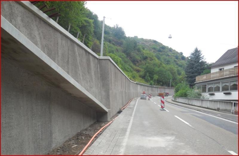 Für die Stützwand in St. Goarshausen wählte die zuständige Baubehörde anhand von Probeflächen eine ortstypische Natursteinmaueroptik zur Betonoberflächenvergütung. Nach dem Rückbau des Zauns auf der Wandkrone, dem Abbruch der Zugangsrampen und der Beseitigung des schadhaften Betons wurden die freiliegenden korrodierten Bewehrungseisen entrostet und der Betonuntergrund gründlich aufgeraut. Nachdem alle Fehlstellen mit Spritzbeton monolithisch geschlossen waren, wurde zusätzlich noch eine 20 cm dicke Stahlbetonschale der Festigkeitsklasse C 35/45 entsprechend der Expositionsklasse XD3, XF2 aus mehreren Lagen Spritzbeton aufgetragen. Konstruktiv wurden zwei Lagen Mattenbewehrung Q 335A schwingungsfrei befestigt und kraftschlüssig eingespritzt. Durch den hervorragenden Verbund des Spritzbetons waren weder eine Haftbrücke noch andere Verbindungsmittel notwendig.