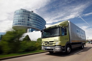 Als europaweit erster Serien-Hybrid-Lkw geht der Atego BlueTec Hybrid nun in den Alltagsbetrieb. 35 Kunden aus Deutschland nutzen den leichten Hybrid-Lkw bereits. Die Basis für den BlueTec Hybrid bildet der Atego 1222 L Euro5, der bereits den umweltfreundlichen EEV-Standard für besonders reduzierten Partikelausstoß erfüllt und auf deutschen Straßen mautfrei fährt. Sein kompakter und leichter Vierzylinder-Dieselmotor mit 4,8 l Hubraum leistet 160 kW (218 PS). Hinzu kommt der wassergekühlte Elektromotor mit einer Spitzenleistung von 44 kW, der über energie- und leistungsstarke Lithium-Ionen-Batterien mit Energie versorgt wird. Der Parallel‑Hybridantrieb erlaubt elektrisches Anfahren und Rekuperation durch den Elektromotor sowie eine Optimierung der Kennlinie des Dieselmotors. Die Zuschaltung der Antriebsleistung des Dieselmotors erfolgt über die Kupplung zwischen Diesel- und Elektromotor. Bis zu diesem Punkt dient der Verbrennungsmotor ausschließlich dem Antrieb der Nebenaggregate. Das ergibt nicht nur eine deutliche Verminderung von Kraftstoffverbrauch und Abgasemissionen von bis zu 15 Prozent, sondern auch eine geringere Geräuschemission. Durch die Nutzung der Motor-Start-Stopp-Automatik werden Kraftstoffverbrauch, Emissionen und Geräusch an der Ampel auf null reduziert.