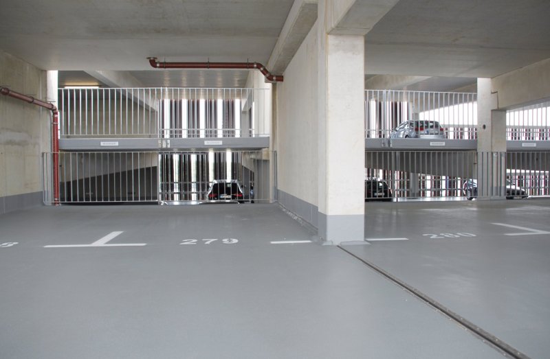 Das 2007 eröffnete Parkhaus wies zahlreiche Risse auf, die eine Sanierung nötig machten. Für die Behebung der unterschiedlichen Schäden an der Bausubstanz, als Sockelbeschichung sowie zur Beschichtung aller Parkflächen und Rampen kamen die beiden Systeme OS 8 und OS 11b der Remmers Fachplanung mit ihrem spezifischen Leistungsprofil zum Einsatz. Das System OS 8 ist besonders verschleißfest und wurde zur Beschichtung der Rampen sowie im Erd- und Untergeschoss verwendet. Es besteht aus Epoxy ST 100, einem transparenten Grundier- und Mörtelharz und der pigmentierten Epoxydharzbeschichtung Epoxy OS Color. Dank seines breiten Anwendungsspektrums eignet sich das System zur Beschichtung von Flächen mit hohen mechanischen Beanspruchungen.