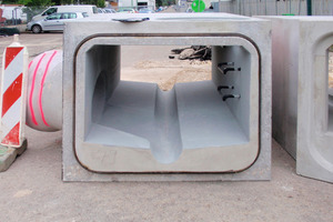 „Bei der Produktion der Profile haben wir die bei der vorab durchgeführten Kamerabefahrung aufgezeichneten Positionen der benötigten Einbindepunkte von Hausanschlussleitungen berücksichtigt und entsprechende Anschlussstücke eingebaut“, erklärt Jörg Rinninger, Geschäftsführung Hans Rinninger u. Sohn GmbH u. Co. KG. Außerdem wurde die Fließsohle nach den Vorgaben des Kunden mit einer Trockenwetterrinne ausgestaltet. Die monolithischen und in der Form erhärteten Bauteile wurden aus einem Hochleistungsbeton mit der Festigkeitsklasse C 60/75 hergestellt und entsprechen den Anforderungen der Expositionsklassen XC 4, XA 2, XD 3 und XF 4. Genauso wie weitere Sonderbauteile vom Krümmer über Seitenzuläufe bis hin zu Schächten, die ebenfalls zum Umfang des Auftrags gehörten. Damit sind sie – wie vom Auftraggeber gefordert – resistent gegen Korrosion und gegen chemische Einflüsse durch Frost und Taumittel geschützt. Ebenso erwähnenswert: Der Beton verfügt über einen sehr hohen Wassereindringwiderstand, die Wassereindringtiefe beträgt maximal 10 mm. „Zur Sicherstellung des erforderlichen Qualitätsstandards werden die Rezepturen und Zuschlagstoffe der Betonprodukte im hauseigenen Versuchslabor durch Betontechnologen permanent kontrolliert“, so Rinninger weiter. „Darüber hinaus entnimmt ein unabhängiger Gutachter regelmäßig Proben aus unterschiedlichen Chargen und prüft die Einhaltung der Normen.“ Gleiches gilt für den Produktionsprozess, der durch erfahrenen Mitarbeiter ständig überwacht wird. Sie sorgen für millimetergenaue Abmessungen, für den exakten Einbau von Verbindungselementen sowie für die hohe Qualität der Betonoberflächen.