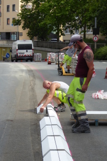 Stellt sich noch die Frage, ob aufgeklebte Bordsteine auch in Punkto Stabilität und Haltbarkeit der herkömmlichen Bauweise das Wasser reichen können? Hierzu Dieter Bannweg: „Die Verklebung auf den glatten Flächen der geschnittenen Steine hält sehr gut, da die Zementhaut hierbei entfernt wird. Zahlreiche Projekte aus der Vergangenheit zeigen uns, dass eine geklebte Bordsteinlösung dauerhaft haltbar ist.“