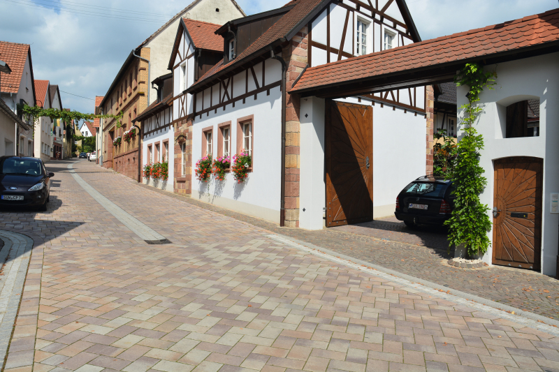 Auch als die Verantwortlichen der Weinbaugemeinde im Jahre 2012 beschlossen, die „Längelsstraße“ zu sanieren, stand von vorne herein fest, dass hier nur ein farbiger Pflasterbelag in Frage kommt, denn die Straße mit den alten Fachwerkhäusern führt direkt zum Deutschen Weintor und hat touristisch damit einen besonders hohen Stellenwert. Günter Burkhart von der Verbandsgemeinde Bad Bergzabern zu den Anforderungen an die neue Flächenbefestigung: „Die Messlatte für das zu verwendende Pflastermaterial hing sehr hoch, denn das Areal wird nicht nur von PKW, sondern auch von Müllautos und vor allem von den Traktoren der Weinbauern befahren. Diese üben große Scher- und Schubkräfte auf den Straßenbelag aus, denen ein herkömmliches Betonpflaster nicht lange standhalten würde. Deshalb suchten wir nach einem Belag, der sich einerseits optisch in das Altstadt-Ambiente einfügt, andererseits aber auch in der Lage ist, die Verkehrsbelastungen aufzunehmen und gleichmäßig in die Tragschichten weiterzuleiten“, erläutert Burkhart.