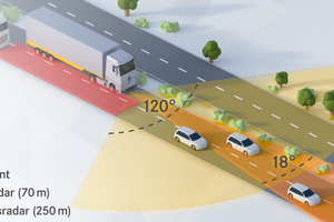 Das neue ABA 4 kann im Rahmen seiner Systemgrenzen nicht nur automatisch auf vorausfahrende Fahrzeuge oder stehende Hindernisse bremsen, sondern warnt nun auch akustisch und optisch vor querenden Fußgängern auf der Frontseite und leitet bei Bedarf eine Teilbremsung ein. Das ermöglicht dem Lkw-Fahrer, mit einer Vollbremsung zu reagieren oder durch ein Lenkmanöver auszuweichen. Darüber hinaus kann der neue radargestützte Abbiege-Assistent den Fahrer – ebenfalls akustisch und optisch – vor stehenden oder sich bewegenden Hindernissen auf der rechten Seite des Lkw warnen. Dazu wurden kritische Szenarien aus der Unfallanalyse zugrunde gelegt und das System speziell auf die Abbiegesituation mit Fußgängern und Radfahrern sowie den Spurwechsel nach rechts ausgelegt. Damit bietet der Abbiege-Assistent dem Fahrer eine wesentliche Hilfestellung bei unübersichtlichen Ab- und Einbiege-Manövern.