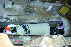 Aufgrund der außergewöhnlichen Rahmenbedingungen hatte sich der Auftraggeber für eine Ausführung mit dem so genannten GFK-Kurzrohrrelining entschieden. Das hat sich in vielerlei Hinsicht bezahlt gemacht: Der Zugverkehr konnte