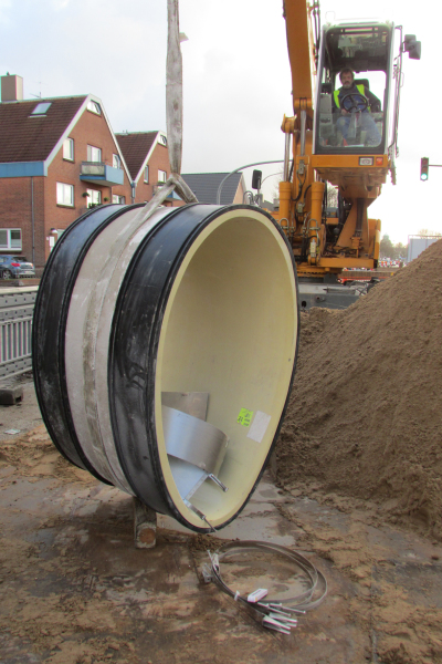 Ungewöhnlich war die Aufgabe, einen dauerhaften und zuverlässig dichten Übergang zwischen einem vorhandenen Festrohrliner und einem neu zu verlegenden Ei-Profil aus GFK herzustellen. Im Unterschied zu kreisrunden Profilen wirken hier andere Zugkräfte – gerade der Bereich des Kämpfers, in dem das Rohr weniger stark gekrümmt ist, stellt einen kritischen Punkt dar. Die Lösung: eine von Mücher eigens für die Lübecker Baustelle konstruierte und produzierte Version der Übergangskupplung Canada Titan XL. „Produkte von Mücher kommen bei uns immer wieder zum Einsatz“, so Beyssell. In diesem Fall sei das Produkt allerdings vom Auftraggeber gezielt ausgeschrieben worden. Mücher-Gebietsleiter Peter Schörling: „Solche Sonderlösungen sind für uns zwar Tagegeschäft. Die für das Projekt in Lübeck just in time entwickelte und gelieferte Lösung war allerdings insofern ungewöhnlich, als sie für ein eher selten verbautes Rohrprofil gefertigt wurde.“ Sowohl bei der Fertigung als auch bei der Handhabung seien daher Besonderheiten zu beachten gewesen. Nicht zuletzt habe die vor Ort verwendete Lösung von Mücher den hohen Ansprüchen entsprochen, den die Entsorgungsbetriebe Lübeck mit Blick auf die Sicherheit sowohl bei Handling und Einbau als auch im Betrieb an die verwendeten Produkte stellen, betont Langer. „Die Canada Titan XL Kupplung in verstärkter, 300 mm breiter Ausführung ist unsere Antwort auf die stetig steigenden Anforderungen im Kanalbau“, bestätigt Schörling. Das Bauteil, dessen Bauart der Bauaufsichtlichen Zulassung Z-42.5-373 entspricht, kann bei allen gängigen Rohrmaterialien der drucklosen Entwässerung ab einem Rohraußendurchmesser von 300 mm eingesetzt werden und hält einem Wasserinnendruck von bis 2,5 bar stand. Schon beim Einbau punktet die robuste, dauerhaft dichte Kupplung mit handfesten Vorteilen: Das Spann-Verschluss-System der Kupplung macht die Montage besonders zeitsparend, zudem wird weniger Werkzeug benötigt als beim Einbau vergleichbarer Produkte. Nicht nur die Produkteigenschaften haben überzeugt, sondern auch der Service: „Die Einbaubeschreibung hat uns den Umgang mit dem Produkt ebenso erleichtert wie die gute persönliche Beratung vor Ort“, lobt Echterhoff-Polier Dirk Pippel. Auch die logistische Abwicklung durch den liefernden Tiefbau-Fachhandel habe gestimmt.