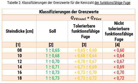 Die Beurteilung der notwendigen Maßnahmen wird auf Basis der in Tabelle 2 enthaltenen Parameter durchgeführt. Dabei ist zu beachten, dass die Empfehlung unter Berücksichtigung des jeweils negativsten Prüfwertes vorgenommen wird. Daraus ergibt sich die Klassifizierung der Grenzwerte für die Kennzahl funktionsfähige Fuge in Abhängigkeit von der Steindicke. Die Klassifizierungen der Grenzwerte sind für die Kennzahl QFEinzel und die Kennzahl QFges, wobei QFges der Mittelwert aus allen Einzelwerten QFEinzel ist, gleichzusetzten. Tabelle 2 zeigt die Klassifizierungen der Grenzwerte.