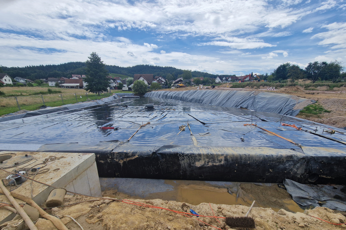 Da das Oberflächenwasser des Neubaugebietes zurückgehalten und dann gedrosselt abgeleitet werden soll, wird die D-Raintank 3000-Anlage mit Kunststoffdichtungsbahnen ummantelt