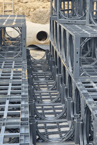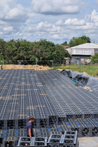 Wesentlich beeinflusst wurden die Tiefbauarbeiten von der Topographie des Geländes. Die Hanglage war einer der Gründe, warum D-Raintank 3000-Rigolenelemente von Funke zum Einsatz kamen. Um die Speicherrigole optimal in das bestehende Gelände integrieren zu können, wurde sie entsprechend angepasst. Bauüberwacher Michael Dupps von RS Ingenieure sagt: „Da, wo das Gelände zum Graben hin abfällt, wurden ‚halbhohe‘ Elemente von 33 Zentimetern eingebaut, während sonst die Standardelemente zum Einsatz kamen.“ Damit weist Dupps auf eine Besonderheit des Systems D-Raintank 3000 hin: Für einen platzsparenden Einbau bietet Funke die Elemente auch als D-Raintank 3000 smallbox an. Während das Standardelement die Maße 600 x 600 x 600 Millimeter aufweist, ist die kleinere Variante mit 600 x 600 x 330 Millimeter deutlich flacher. In Achern war dies die optimale Lösung für die Anforderungen des Standorts, zumal die bautechnischen Eigenschaften der gebrauchsfertig ausgelieferten D-Raintank 3000 smallbox der regulären Ausführung in nichts nachstehen. Funke-Fachberater Jürgen Gäßler betont: „Die Elemente sind so konzipiert, dass sie äußerst robust sind. Das hohe Elastizitätsmodul von 3000 N/mm² in Kombination mit der ausgeklügelten Konstruktion ergeben eine hohe Tragfähigkeit der Bauwerke.“
