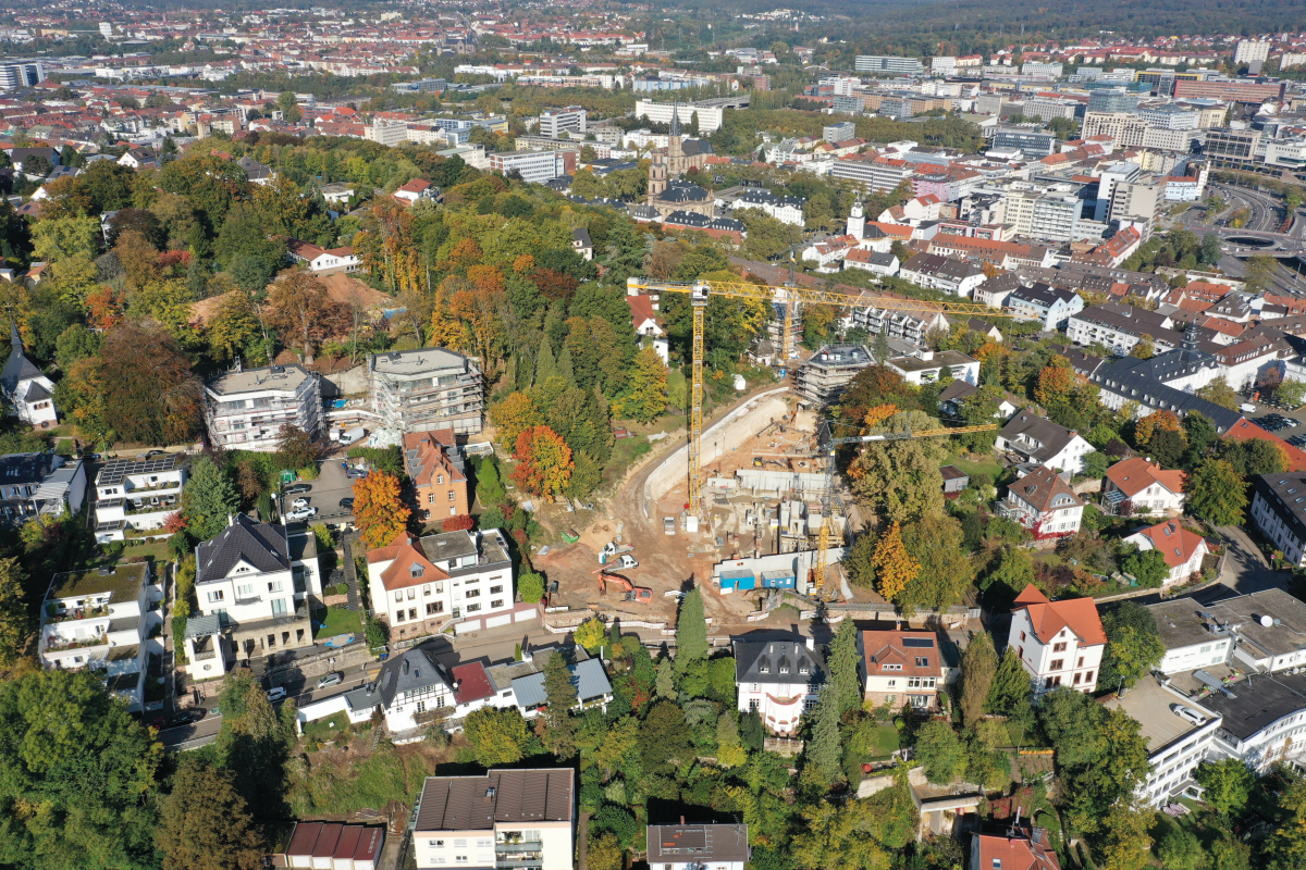 Der Baumbestand war während der Errichtung explizit zu schützen. Dies brachte klare Ausgrenzungen mit sich, auf denen während der gesamten Bauphase nichts stehen oder gelagert werden durfte. Weiter erschwert wurden die Grundstückserschließung und Baustellenlogistik durch die starke Topografie und die umliegenden engen Straßen der Altstadt. Ein Verkehrskonzept definierte daher zunächst Kranpositionen, Anfahrtsrouten, Wartestellen sowie Lagerplätze für Materialien. Das Gelände teilte man in vier Baufelder. Der Spatenstich erfolgte auf Baufeld 2, das gleichzeitig auch ein Pilot für das Projektteam war, um die Umsetzung gemeinsam mit Ordnungsamt und direkter Anwohnerschaft zu prüfen. Im Anschluss folgten die übrigen Baufelder, für die das Büro Amy Plan GmbH die Bauleitung übernahm.
