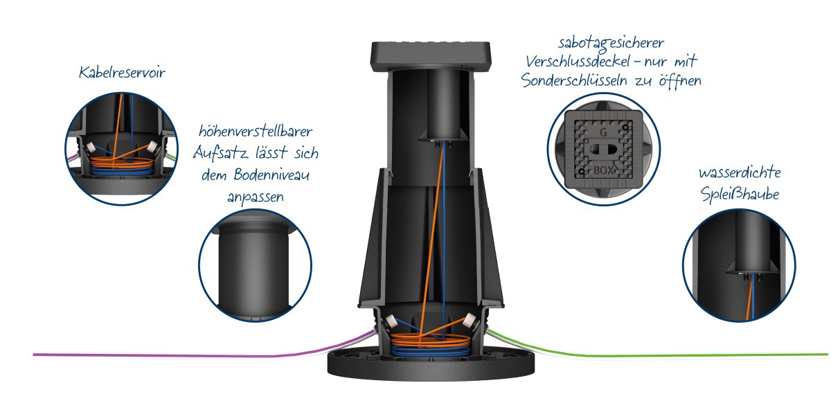 Die G-Box von Hauff Technik ermöglicht, ganze Straßenzüge in nur einem Arbeitsgang mit Glasfaser zu erschließen. Die einzelnen Häuser können später darauf zugreifen, ohne dass Straßen oder...