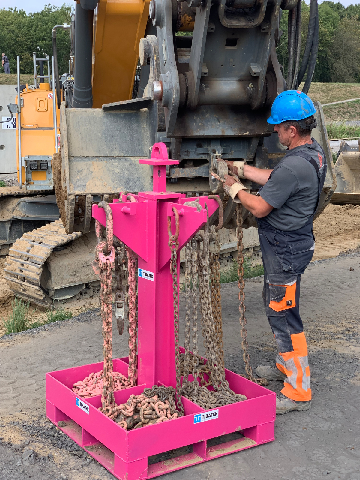 www.tibatek.deDer Kettenständer KS 12 löst nicht nur das Lagerproblem von Ketten auf Tiefbaustellen, sondern schont außerdem die Gesundheit. Zum Einhängen wird das Kettengehänge z.B. vom Bagger...