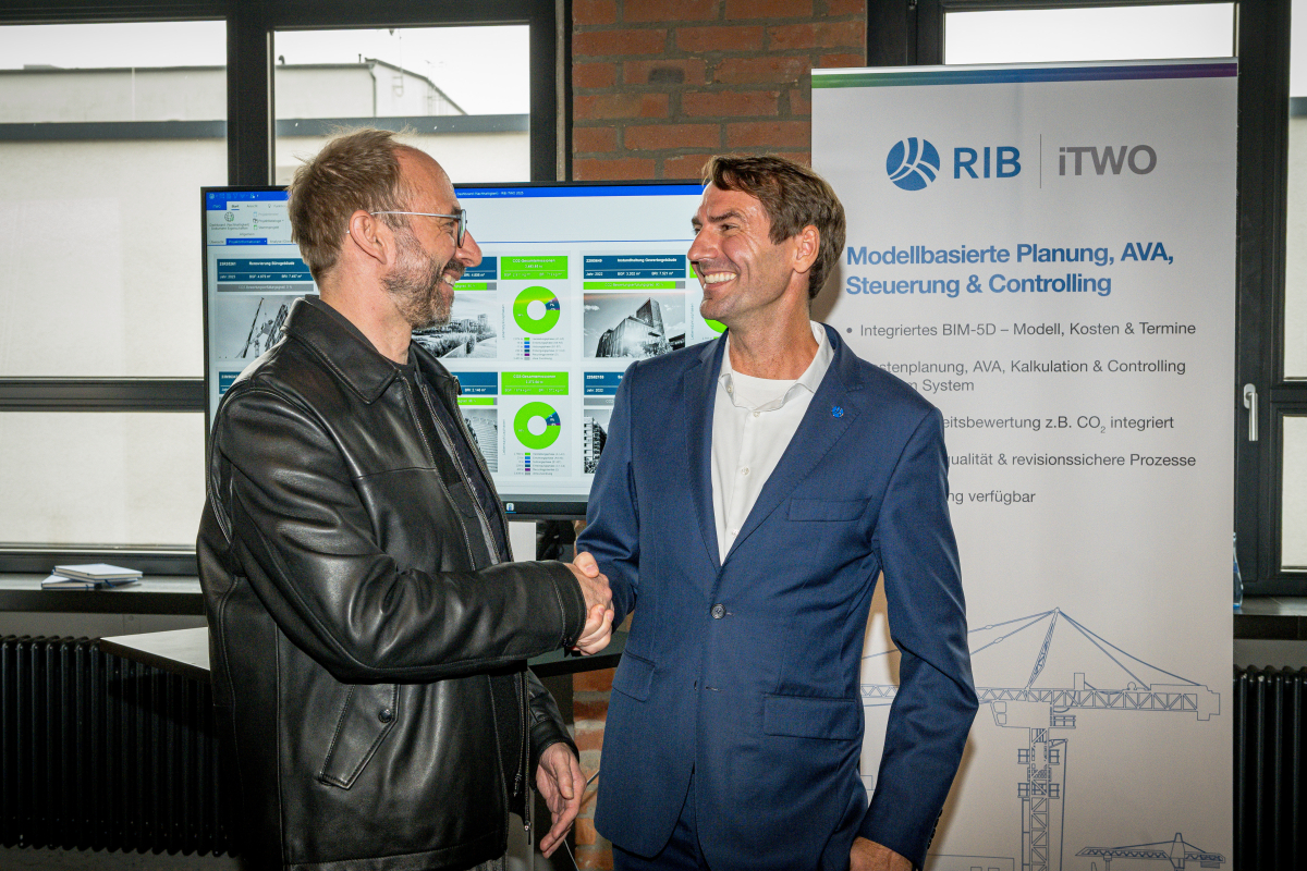 Das Hochbauamt der Landeshauptstadt Stuttgart hat sich für eine flächendeckende Einführung der Software RIB iTWO entschieden. V.l.: Dipl.-Ing. Architekt Andreas Rahmer, Abteilungsleiter beim Hochbauamt und Martin Muth, Geschäftsführer der RIB Deutschland GmbH, besiegeln die Zusammenarbeit