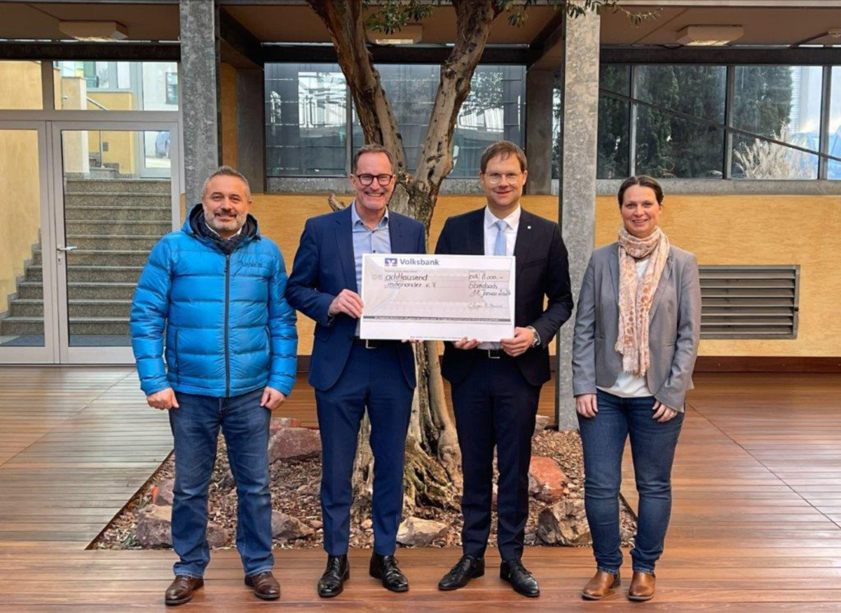 Vertreter der Firma Layher übergeben im Namen der Mitarbeiterinnen und Mitarbeiter eine Spende über 8.000 Euro an den Verein miteinander e. V.: Layher Betriebsratsvorsitzender Abdullah Mese, Vorsitzender des Vereins miteinander e. V. Joachim Scholz, Layher Geschäftsführer Tobias Dürmeier sowie die stellvertretende Layher Betriebsratsvorsitzende Anke Rausch (v. l. n. r.).