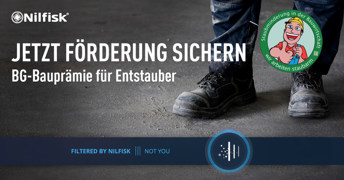 Aktiver Gesundheitsschutz durch den Einsatz von Bauentstaubern 31.05.2021Aktive Staubkontrolle ist in nahezu allen Gewerken ein zentraler Baustein des betrieblichen Gesundheitsmanagements. Deshalb profitieren die Mitglieder der Berufsgenossenschaft für die Bauwirtschaft – kurz BG Bau – auch in diesem Jahr von einer attraktiven Fördersumme beim Kauf eines entsprechenden Bauentstaubers. Im Zuge dessen werden auch acht verschiedene Modelle des Reinigungsgeräteherstellers Nilfisk mit bis zu 750 Euro bezuschusst.