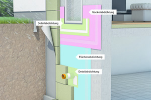 In den Normenteilen zwei und drei wird der größere Praxisbezug gegenüber der alten Norm besonders deutlich. Denn hier finden erstmals auch Detailanschlüsse wie unter anderem die Verbindung der Abdichtung mit Durchdringungen, Einbauteilen oder angrenzenden Bauteilen Berücksichtigung. Ferner gibt die Norm Hinweise zum Anschluss von Abdichtungen an WU-Beton und geht auch auf die Detailausbildung im Bereich von Gebäudeaußentreppen oder vorgefertigten Lichtschächten ein. Als Abdichtung für Detailausbildungen eignet sich beispielsweise der Flüssigkunststoff Imberal DAB 30P von Hahne. Detailliert beschrieben ist in der DIN 18533 zudem das Thema Querschnittsabdichtungen. Hier sind nun auch mineralische Dichtungsschlämme (MDS) geregelt. Letztere fanden in der DIN 18195 bereits Erwähnung, waren jedoch nicht in den Ausführungsteilen für den erdberührten Bereich enthalten. MDS werden in der Praxis oftmals als Alternative zu bahnenförmigen Abdichtungen eingesetzt. Sie sorgen beispielsweise im Wandquerschnitt für einen kraftschlüssigen Verbund zwischen Abdichtung und Mauermörtel, wodurch das Risiko von scherkraftbedingten Abrissen der Außenabdichtung reduziert wird. Im Sockelbereich gewährleisten MDS einen stabilen Untergrund für aufzubringende Materialien.