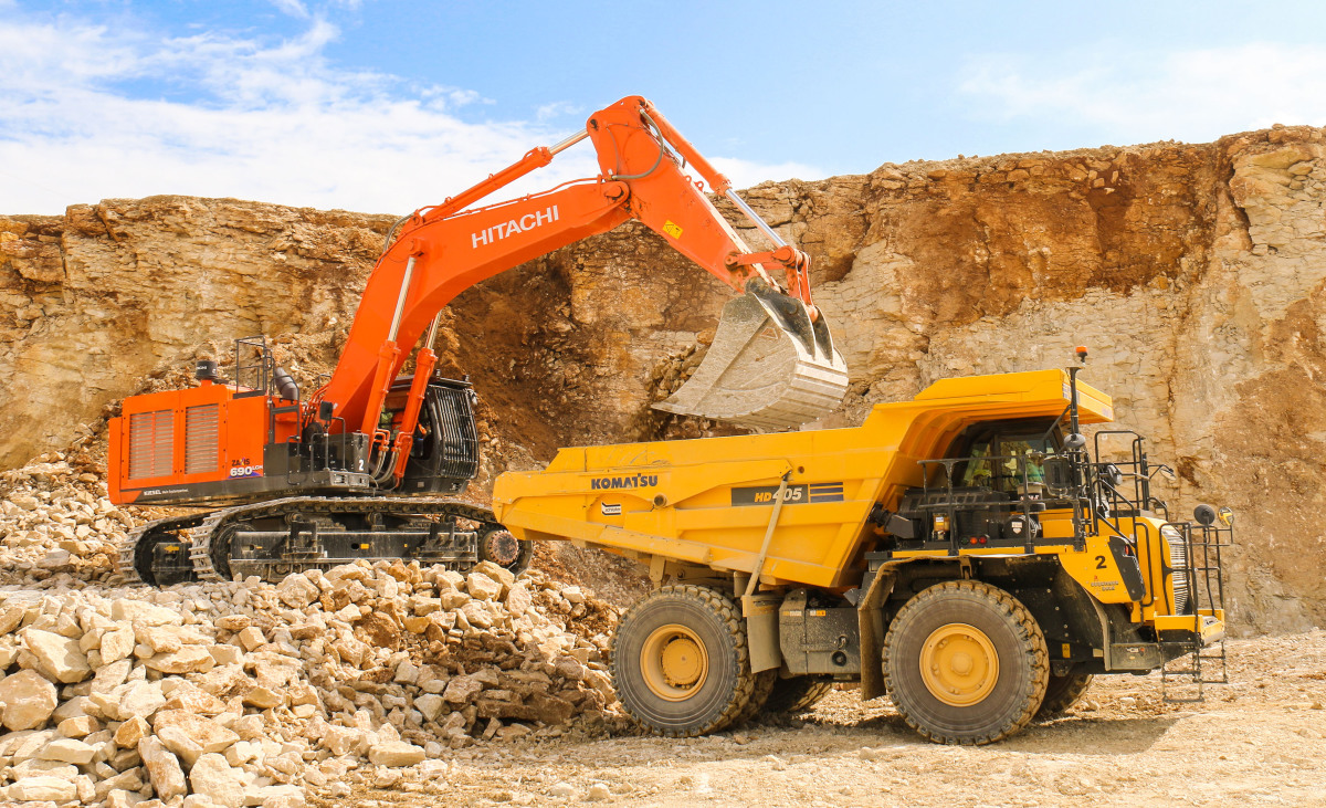 Zwei neue 70-Tonnen-Bagger ZX690 von Hitachi verrichten täglich Herkules-Arbeiten. „Die beiden Hitachi verladen das gesamte gesprengte Material zum Abtransport in Muldendumper“, berichtet Harald Bayer, Steinbruchleiter bei Bergmann Kalk. „Und das tun sie den ganzen Tag.“ Das enge Ladespiel verlangt den Maschinen alles ab. Vier Kubikmeter fassen die riesigen Löffel, pro Ladespiel verladen die Bagger-Giganten mehrere Tonnen Kalkgestein.