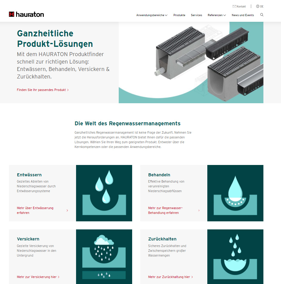 07.06.2022Hauraton präsentiert einen neuen Internetauftritt. Das Unternehmen hat Markenpräsenz und Website einer Komplettüberarbeitung unterzogen und diese kundenfreundlicher gestaltet. Bauunternehmern, Ingenieuren, Architekten, Planern und Händlern wird damit eine hochmoderne Online-Plattform zur Verfügung gestellt, mit der sie jeder passenden Lösung zum Regenwassermanagement für ihre Projekte schnell auf die Spur kommen.
