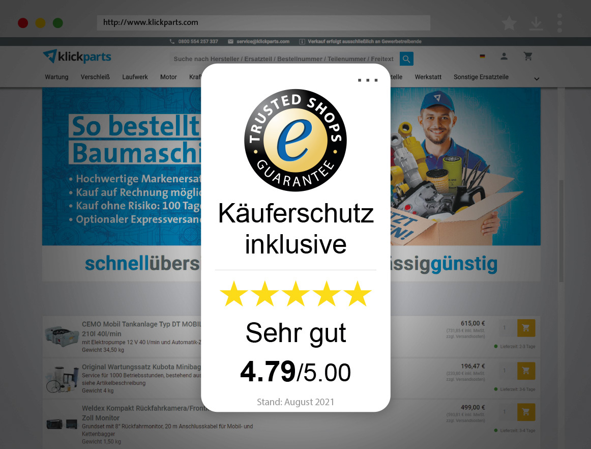 06.08.2021Hier kaufen Sie sicher ein!“ Die Klickparts GmbH, die seit über zwei Jahren im Online-Vertrieb Ersatzteile und Wartungsprodukte für Baumaschinen anbietet, ist nun offiziell seitens Trusted Shops zertifiziert und zählt damit zu den garantiert sicheren Shops – nicht nur in Deutschland, sondern in ganz Europa. Die Auszeichnung steht für geprüfte Sicherheit im E-Commerce und wirkt damit unmittelbar vertrauensbildend für Verbraucherinnen und Verbraucher.