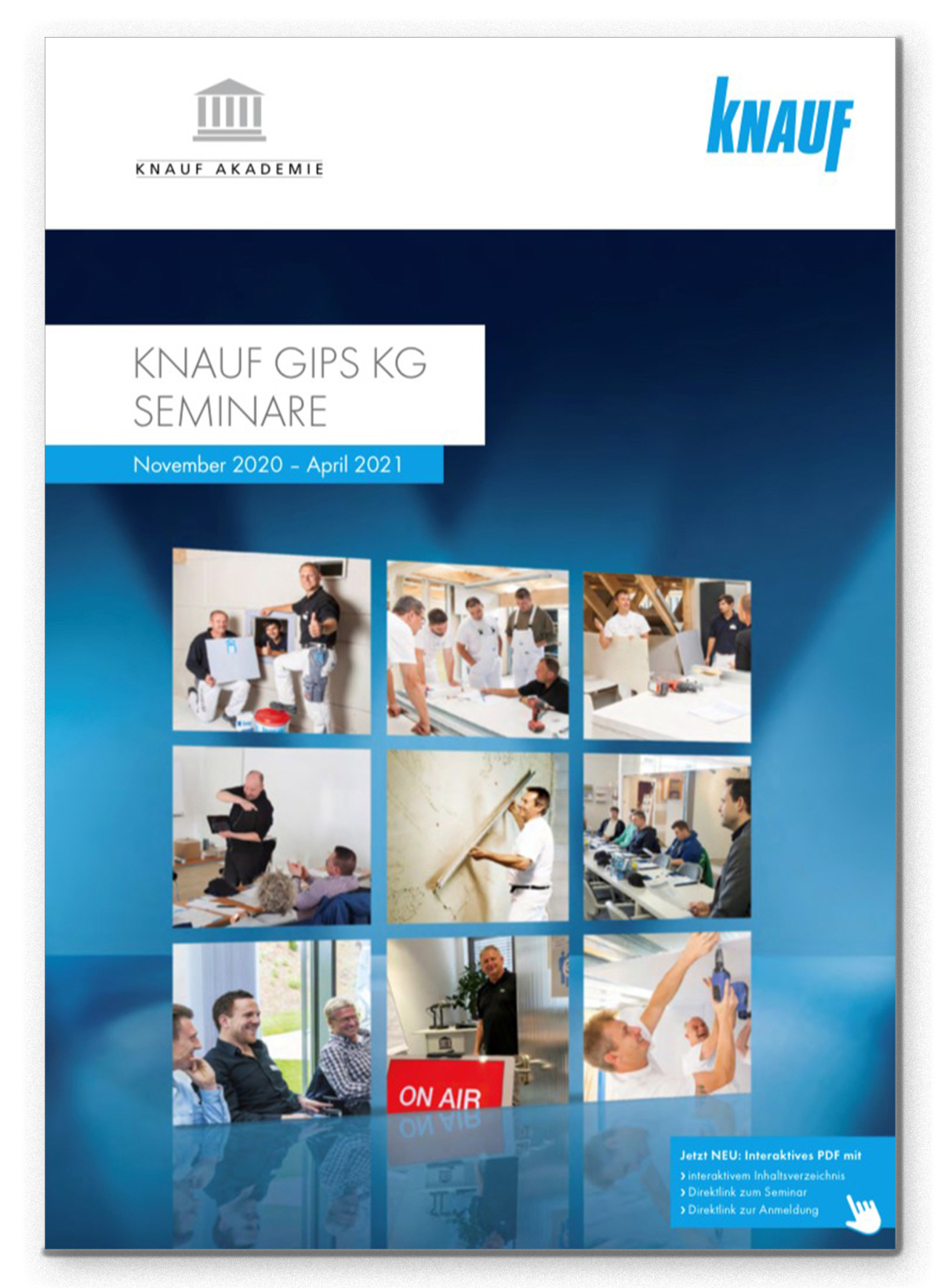 Eine Übersicht über alle Seminare liefert die Internetseite der Knauf Akademie. Hier kann die Seminarbroschüre auch als PDF abgerufen werden. Neben den Terminen und Inhalten der einzelnen Veranstaltungen kann man sich über die Website gleich direkt anmelden.