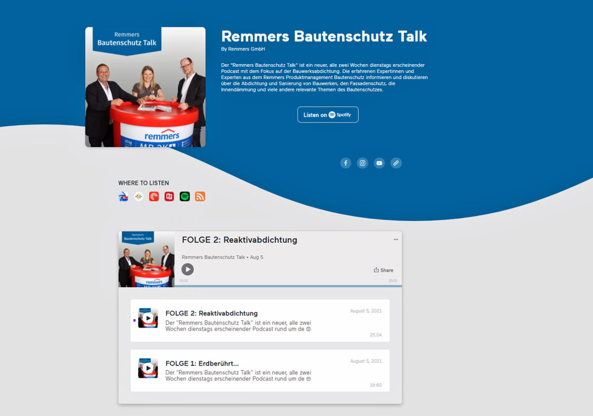 Alle zwei Wochen erscheint jeweils dienstags eine 20- bis 30-minütige Folge des Expertengesprächs der Remmers Bautenschutz-Produktmanager Natascha Büsing, Jens Engel und Rainer Spirgatis. Die Spezialisten informieren dabei in einem auf allen gängigen PCs, Tablets und Smartphones abrufbaren Podcast über die aktuellen Herausforderungen und Lösungsansätze bei der Abdichtung und Sanierung von Bauwerken, beim Fassadenschutz, der Innendämmung und weiteren relevanten Bereichen des zukunftsgerechten Bautenschutzes.