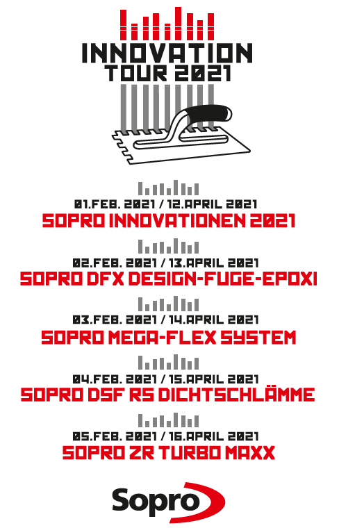 Neue Wege bei der Neuheiten-Präsentation 08.01.2021Die Sopro Bauchemie wird ihre Neuprodukte für das Jahr 2021 im Rahmen einer digitalen „Sopro Innovation Tour 2021“ vorstellen. Mit dem neuen, digitalen Format werden den Kunden die aktuellen Neuprodukte der Sopro kurz und kompakt in einer jeweils einstündigen O-LIVE Show präsentiert.