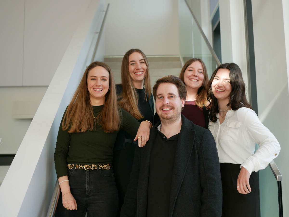 Vom Trainee-Jahrgang 2022-24 haben drei der Trainees ein Match bei einem Mitgliedsunternehmen der Initiative Deutschland baut! e.V. gefunden: Lena Kempf, Eva Sauer, Timo Czarnecki, Clara Marx, Sina Ziegler (v.l.).